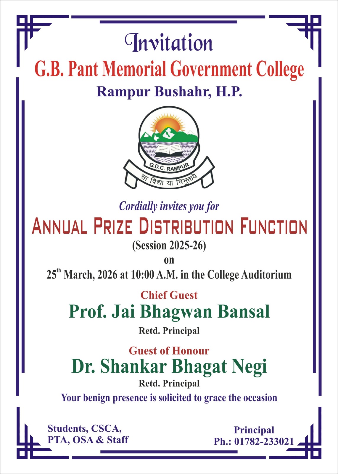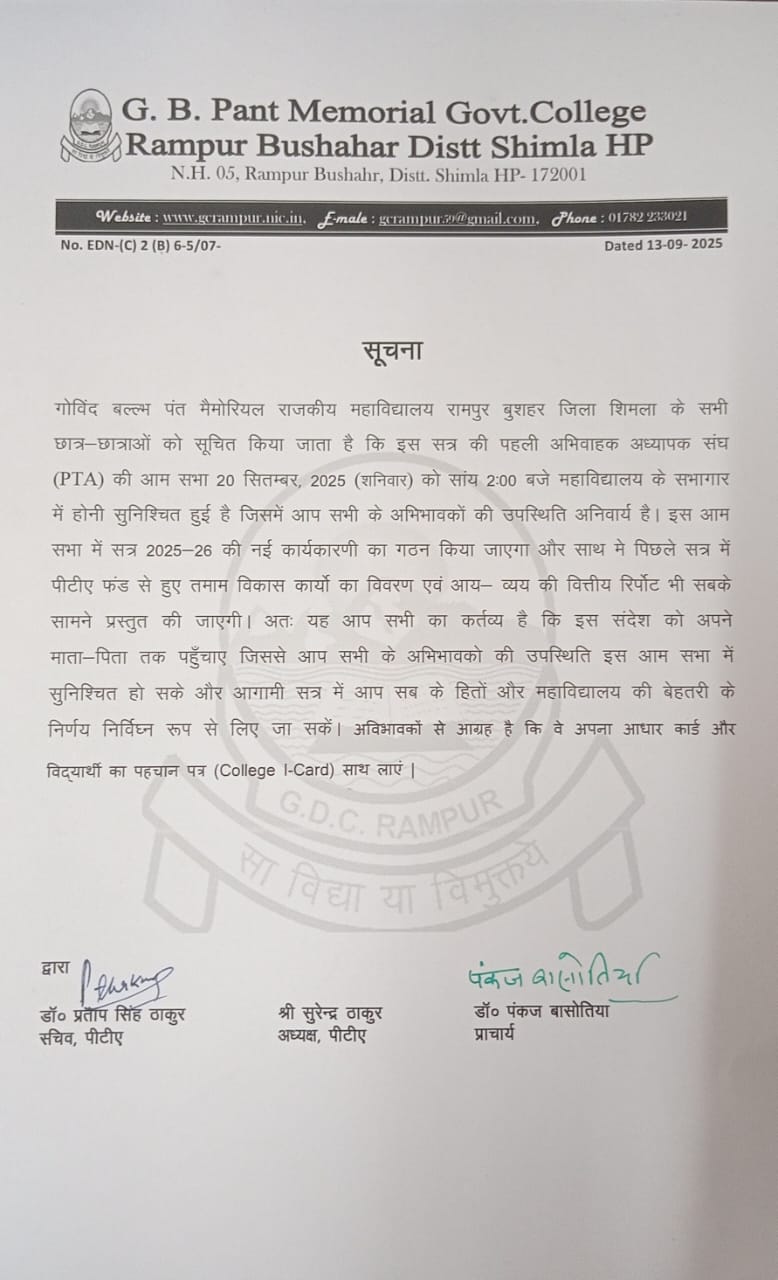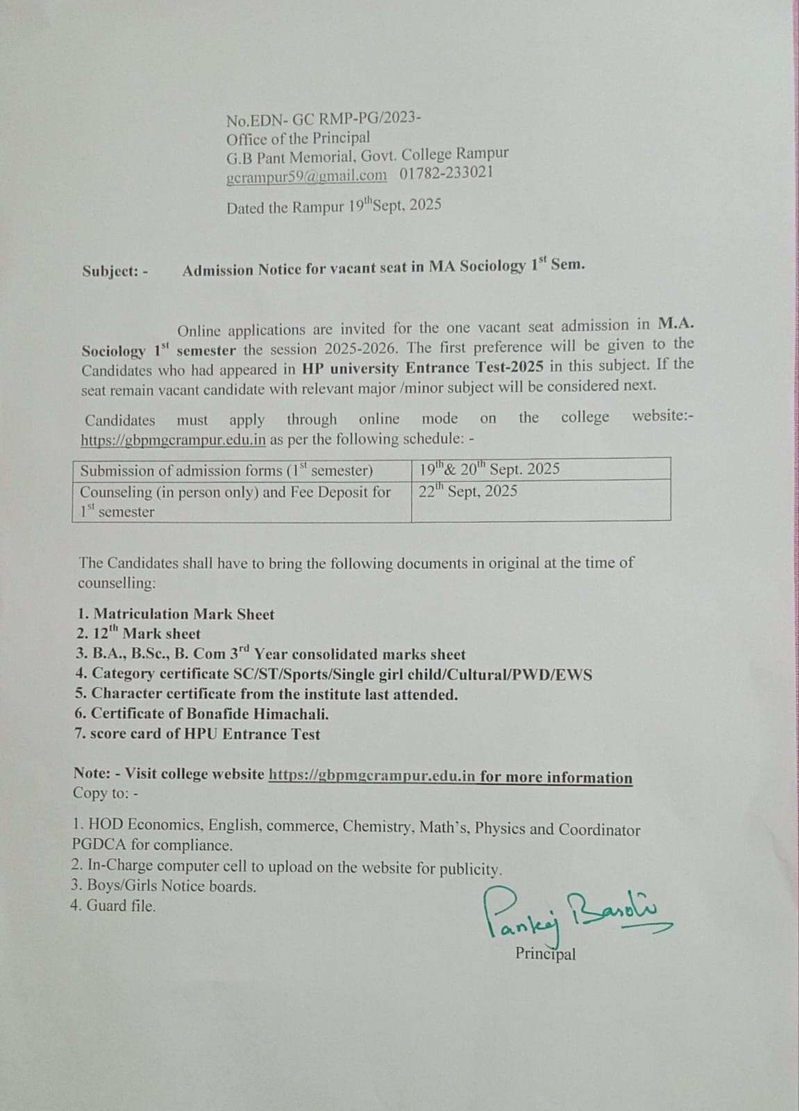 The college is named after the country’s prominent freedom fighter, great administrator and the recipient of the Bharat Ratna-- Sh. Govind Ballabh Pant, and is duly affiliated to Himachal Pradesh University (Shimla). This college came into existence in July, 1959 but was formally inaugurated on 11th November, 1959 by Raja Bajrang Bahadur Singh of Bhadri estate, the then lieutenant Governor of Himachal Pradesh. Situated on the left bank of the river Satluj, the college is on the national highway no. 5 and at a distance of about 130 km from the historical town of Shimla, the capital city of Himachal Pradesh...